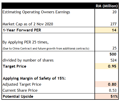 Given that this company grew Estimated Operating Owners Earnings to from RM9.2m to RM26.9m, as well as the Alibaba/Baidu data centre contract, I think a PE Ratio of 25 times is appropriate. For the record, most data centre companies are either 40-50 times Earnings, or 20-40 times Revenue.