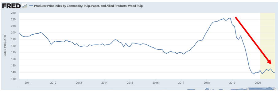 Since the second half of 2019, prices for wood pulp have fallen drastically and have stayed down mainly due to reduced usage of papers, while capacity expansions by wood pulp companies coincided with the coronavirus pandemic. Until the current industry consolidation is completed, prices for wood pulp are expected to stay low.