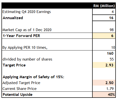 Now, I do think using Q4 2019 RM6m in earnings may be to optimistic. However, Q2 2019 earnings are a little too low as it does not include the full Vietnam factory contribution. With that in mind, we will use a conservative RM 4m in net profit for our projections.