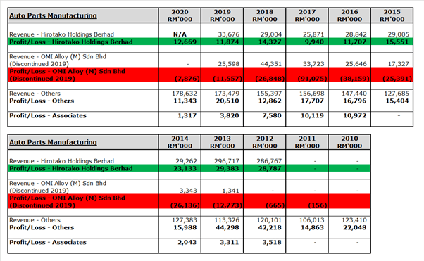 In addition, in 2012 the company also started OMI Alloy (M) Sdn Bhd, an alloy wheel manufacturing company. Both companies are under the Auto Parts Manufacturing Segment. How has these companies performed over the years?