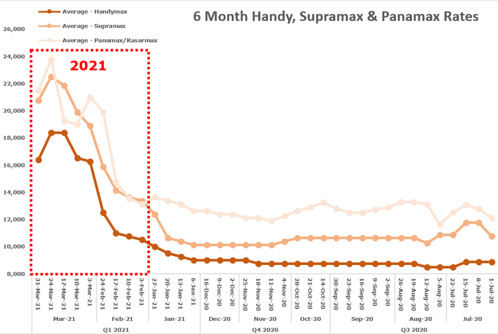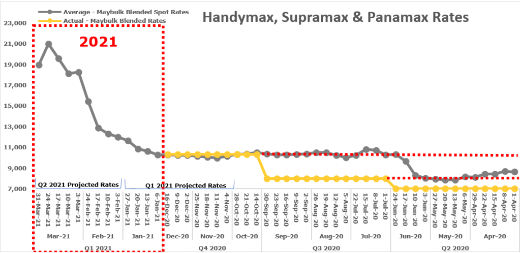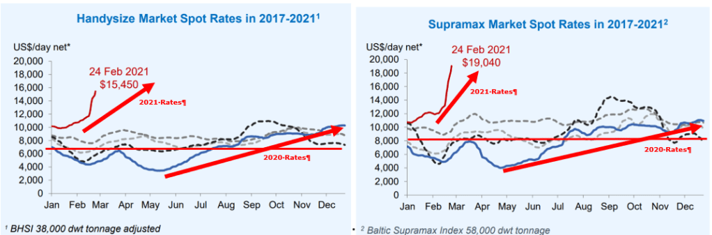 However, for the Handysize and Panamax sized ships (which Maybulk’s fleet consist of), charter rates have continuously increased in 2021, even before the Suez Canal Blockage.