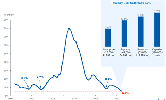 In 2021, order books for dry bulk carriers are at an all-time low, at just 5.7% of total supply. The last time order books were this low was in 2003, and it resulted in charter rates for Maybulk maintaining at USD 20,000 per day and flying to as high as USD 37,000 per day.