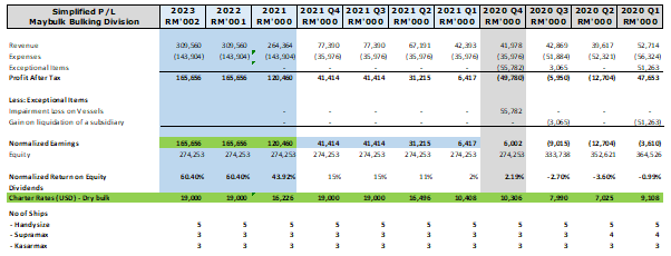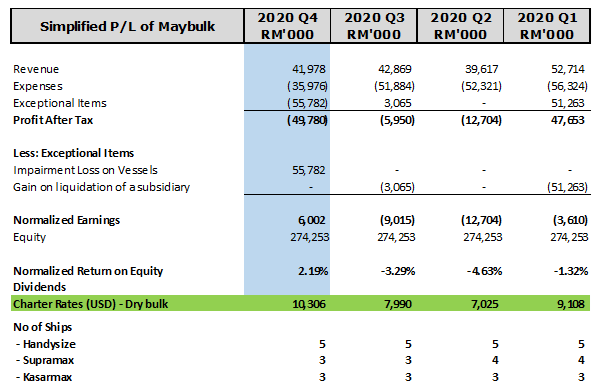 On Q4 2020, Maybulk was forced to record an impairment loss of RM56m on their ships last year due to Charter Rates due to the COVID pandemic, which resulted in lower vessel value in the market.